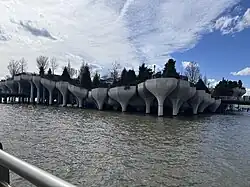 Arup Group oversaw the structural design of the park.[7][8] Little Island is supported by 132 pot-shaped structures suspended above the water.[7][9] These "tulip pots" vary in height and are between 15 and 62 ft (4.6 and 18.9 m) above the mean waterline.[7] This was meant to protect the park from a 500-year flood, in which the water level in the river rises as much as 11 ft (3.4 m).[10] The heights of the pots were intended to give the appearance of a floating leaf[2] or a wave.[10] Numerous other firms were involved in the structural design, including precast cement contractor Fort Miller Company, marine consultant Mueser Rutledge Consulting Engineers, and marine contractor Weeks Marine.[10]