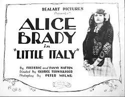 Little Italy is a 1921 American comedy film directed by George Terwilliger and written by Tom McNamara and Peter Milne. The film stars Alice Brady, Norman Kerry, George Fawcett, Jack Ridgeway, Gertrude Norman, and Luis Alberni. The film was released in July 1921 by Realart Pictures Corporation.[1][2][3]