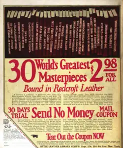 The enterprise prospered. Scherman resigned from J. Walter Thompson to become president of the Little Leather Library Corporation and oversee production.[6] After the Whitman’s order came additional titles, sold by Woolworth's for ten cents each.[7] In 1917, it is estimated Woolworth's ordered over 1 million copies.[8] The Little Leather Library Corp. later issued a set of “Thirty World’s Greatest Masterpieces,” capitalizing on the clamor for access to liberal culture and providing consumers with a “handsome mahogany or quartered oak bookrack ... attractive enough to ornament any library table” for purchasers to display their refinement.[9] In the first year, sixty titles — all in the public domain — were published, and one million were sold in a little over a year.[9]