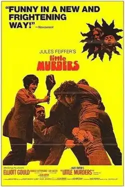 Little Murders is a 1971 American black comedy film directed by Alan Arkin, in his feature film directorial debut, and starring Elliott Gould and Marcia Rodd.[3] Based on the stage play of the same name by Jules Feiffer, it is the story of a woman, Patsy Newquist (Rodd), who brings home her boyfriend, Alfred Chamberlain (Gould), to meet her severely dysfunctional family amidst a series of random shootings, garbage strikes and electrical outages ravaging their New York City neighborhood.