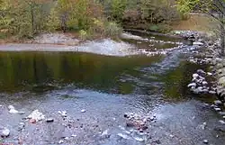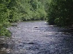 Beyond Walland, Little River cuts a wide gap in Chilhowee Mountain before descending into the Maryville-Alcoa flatlands. As it steadies, the river no longer displays the extreme clarity and attractive rocky bottom of its upper reaches and resembles a more typical stream in a moderately rolling, somewhat rural area. From the old mill dam at the Peery's Mill site north of Walland to the river's mouth at Ft. Loudoun Lake (approximately 19 miles), the river is generally navigable with a canoe, with the exception of a dangerous low-head dam at the Rockford Manufacturing Company in Rockford.[16] Little River flows through farmland, under U.S. Highway 411, and passes through the cities of Maryville and Alcoa before reaching Rockford.