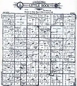 Organization of Little Rock Township was approved by the Nobles County Board on September 3, 1872. On Joseph Nicollet's original 1842 map of the region, the Blue Mound near present-day Luverne is simply designated as The Rock. The river that flows near it was known by the Indians as Inyan Reakah, or River of the Rock. We know this as the Rock River. Little Rock Township gets its name from the Little Rock River that flows through the township and is one of the major tributaries of the Rock River.[3]