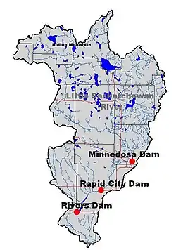 The Little Saskatchewan River is a river in western Manitoba. It originates in Riding Mountain National Park at Lake Audy and flows about 65 miles (105 km) south through the communities of Minnedosa and Rapid City. Its approximate length is 185 km. It joins the Assiniboine River about 6 miles (9.7 km) west of Brandon. The watershed has an area of 1,400 square miles (3,600 km2). The watershed includes numerous lakes and three man-made reservoirs (Minnedosa Lake, Rapid City Reservoir and Lake Wahtopanah.