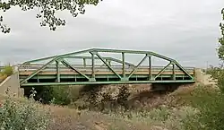 "Constructed over the Little Thompson River by Gardner Brothers in 1938, the bridge is associated with the development of US Hwy. 87 north of Denver. Subsequently becoming the route for today’s I-25, the highway served as a major north-south route, joining the major population centers along the western edge of Colorado’s high plains. Designed by the Colorado Department of Highways and fabricated by Midwest Steel & Iron Works, the single span rigid connected camelback pony truss runs for 104 feet" | |