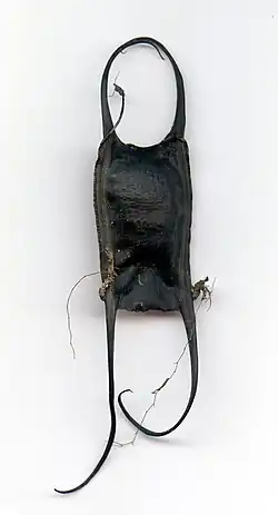 Eggs raised in captivity hatch in 5–6 months, while those in the wild may take up to 12 months to hatch, depending on temperature. While inside the case, the embryos have a whip-like extension on the tail believed to be used for circulating water. The newborns measure 93–102 mm (3.7–4.0 in) long and are perfectly formed miniatures of the adults. After hatching, the empty egg capsules often wash ashore and are known as "mermaid's purses". Growth is about 10 cm (3.9 in) per year for the first three years, then slows down to 5 cm (2.0 in) per year between the third and fourth years. At adolescence, males become larger than the females, and this difference persists through adulthood. Males mature at 32–43 cm (13–17 in) long and females at 36–45 cm (14–18 in) long. Very few little skates over 5 years old have been found, suggesting a high mortality rate at that age.[3][5]