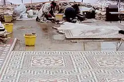 In 1727–1728 William George discovered the Orpheus mosaic whilst digging post-holes, and it was reported as "the finest pavement that the sun ever shone upon in England".[2] An engraving and drawing were made and the villa was reburied. Its location disappeared from memory. It was rediscovered in 1976 and the mosaic fully restored by 1980.[3]