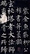 Liu Gongquan (simplified Chinese: 柳公权; traditional Chinese: 柳公權; pinyin: Liǔ Gōngquán; Wade–Giles: Liu Kungch'üan), courtesy name Chengxuan (誠懸) (778—865), was a Chinese calligrapher, essayist, and politician who lived during the late Tang dynasty. Liu Gongquan was especially famous for regular script (楷書) and was one of the 4 calligraphic masters of regular script in China. The other three were Yan Zhenqing, Ouyang Xun and Zhao Mengfu.