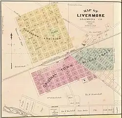 Private grade schools were operating in Livermore from the 1860s on.[21] The Livermore Collegiate Institute was founded in 1870, and Union High School (later called Livermore High School) graduated its first class of students in 1896. There was an old bullfight ring that survived until at least 1870.[21] By 1876 the town had grown and a fire company, churches, a bank, and a library were built. Livermore was officially incorporated by the state as a city in April 1876.[21]