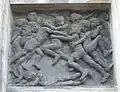 Below the statute is a modern Egyptian-style portico in Portland stone with four giant order square columns rising three floors, framing three entrance doors. Above each door is a ciment fondu relief panel also by Epstein, installed in 1955, representing the new generation who will benefit from the rebuilding: one of children fighting, another of a baby in a pram beside a dog, and the third depicting children playing. The children are modelled on Epstein's children and grandchildren.