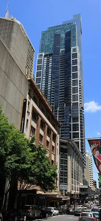 World Square is a large commercial and residential development which takes up a whole block, bounded by Liverpool Street, George Street, Goulburn Street and Pitt Street. It features a shopping centre, hotel, office buildings and apartment towers. Liverpool Lane, off Liverpool Street, is part of World Square and features restaurants, cafés and take away shops.
