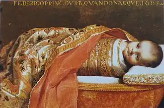 On 16 May 1605 at the Ducal Palace of Pesaro, Livia gave birth a son, Federico Ubaldo della Rovere.[6] The birth of a long-awaited male-heir repaired the relations between Livia and Francesco Maria II for a while, but the aging Duke showed little interest in his son, leaving him under the affectionate care of his mother for some time; however, he eventually removed the child from Livia's care and sent him to Florence to continue with his education, while she was virtually imprisoned in the Casteldurante Palace.[7] Separated from her son, Livia wrote several letters to him: for example, in one of them dated 19 June 1616 she called herself as his "Most Loving Mother, who loves you as her own soul" (Amorevolissima madre, che vi ama quanto l'anima). The distance from both parents meant that Federico Ubaldo became in a troubled child and later in an arrogant and reckless teenager.[1]