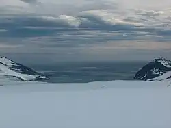 The principal mountain formations on the island comprise Tangra Mountains (32 kilometres or 20 miles long and 8.5 kilometres or 5.3 miles wide, with Mt Friesland rising to 1,700.2 m or 5,578 ft[10][11]), Bowles Ridge (6.5 km or 4 mi long, elevation 822 m or 2,697 ft), Vidin Heights (8 km or 5 mi, 604 m or 1,982 ft), Burdick Ridge (773 m or 2,536 ft), Melnik Ridge (696 m or 2,283 ft) and Pliska Ridge (667 m or 2,188 ft) in the eastern part of the island, and Oryahovo Heights (6 km or 4 mi, 340 m or 1,115 ft), and Dospey Heights (6 km or 4 mi, 265 m or 869 ft).[2] The local ice relief is prone to change; in December 2016 the elevations of Mount Friesland and St. Boris Peak were 1,693 m (5,554 ft) and 1,699 m (5,574 ft) respectively, making the latter the summit of Livingston in that season.[12] According to the American high accuracy Reference Elevation Model of Antarctica (REMA), Mount Friesland is 8 m (26 ft) higher than St. Boris Peak.[13]