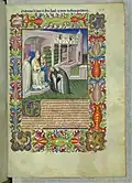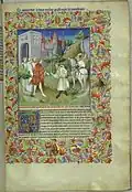 The manuscript was made in France around 1410–1412.[1] It contains 297 folios and 265 miniatures produced by several Parisian workshops, thought to be those of the Mazarine Master, Boucicaut Master, and Bedford Master.