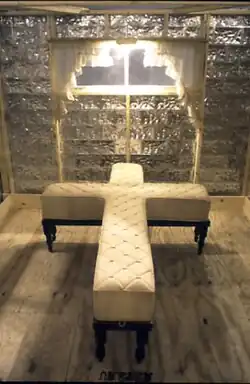 Young's early work (e.g., Psychic Bleeding, 1986; The Allowance of Pain, 1990–2), featured crudely-wrought assemblage "machines," arranged in theater-like installations and used in performances (which she termed "live procedures") that investigate bodily issues of endurance, struggle, constraint, and the transcendence of pain and limitation.[36][24][3][37] The apparatuses drew on a vocabulary of forms derived from positions of the human body (seated, standing, etc.) and recalled hospital gurneys, operating tables, dunking and electric chairs, confessionals or coffin/cradles.[35][38][24] The contrary processes and materials of their fabrication, however, often precluded practical function,[6][5][22] rendering them, in one description, "ominous and unknowable."[38] Critics such as Roberta Smith of New York Times and Suzanne Muchnic of the Los Angeles Times identified them as homespun and antiquated-looking implements of torture, humiliation or extreme toil[15] that comprised a "horrific prison" of heavy metal contraptions conjuring institutional and political confinement.[14][34] Vacillating between public and private spheres, the installations physically positioned viewers as complicit voyeurs, potential victims, or perpetrators within spaces and situations implying danger, imprisonment, or ritual.[6][35][12]