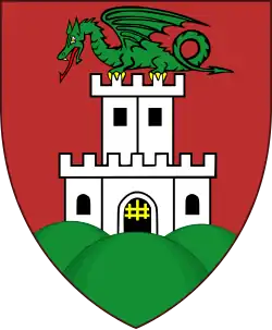 The castle is depicted on the city's coat of arms, along with a dragon on top.