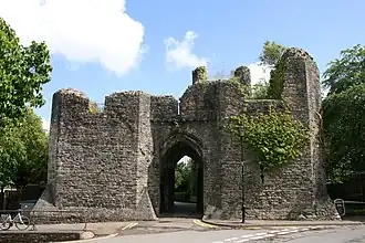 The Bishop's Palace, also known as Llandaff Castle or Bishop's Castle[2][3] now in ruins, lies to the south of the cathedral. It is believed it was constructed at a similar date to Caerphilly Castle, in the late 13th century. It is also believed it was abandoned after being attacked and damaged by Glyndŵr in the 15th century.[4] The gatehouse of the Palace survives, and the courtyard is now a public garden.[4]