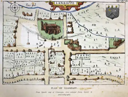 Llandaff never developed into a chartered borough, and by the 19th century, was described as "reduced to a mere village... It consists of little more than two short streets of cottages, not lighted or paved, terminating in a square, into which the great gateway of the old palace formerly opened, and where are still several genteel houses."[5]