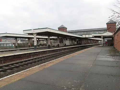 Initially the Conwy Valley line ran into a separate platform on the south side of the station, and a refreshment room was built in 1864. But more space was needed to cope with both main line and branch-line traffic, and on 1 October 1897 the present station was opened[1] on a much larger site, the two island platforms offering six through lines with two bays at each end (a total of four through platforms and four bay platforms). The opening of the new station allowed the demolition of the former station, but also entailed a diverting of the Conwy Valley branch, which now joined the main line some half a mile further east. The old formation was used to store locomotives.