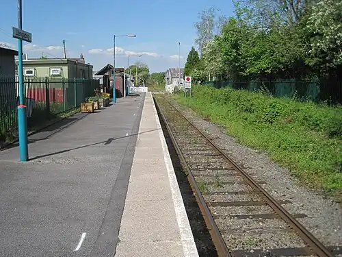 There was also a passing loop and second platform here until the mid-1960s, with a substantial main building on the northbound platform, but these (and the large GWR signal box) have been demolished and removed. The site of the southbound platform is now heavily overgrown.[1]