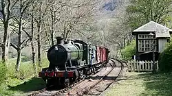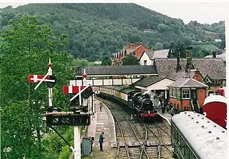 The Llangollen Railway (Welsh: Rheilffordd Llangollen) is a volunteer-run heritage railway in Denbighshire, North Wales, which operates between Llangollen and Corwen. The standard gauge line, which is 10 miles (16 km) long, runs on part of the former Ruabon – Barmouth GWR route that closed in 1965. It operates daily services in the summer as well as weekends throughout the winter months, using a variety of mainly ex-GWR steam locomotives as well as several diesel engines and diesel multiple units. A 2+1⁄2 miles (4 km) extension of the railway has been built to complete the line to Corwen.[1]
