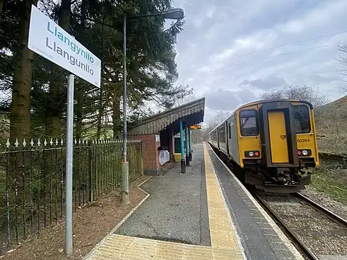 Llangynllo railway station is a countryside stop in Powys about 5 miles west of Knighton, on the Heart of Wales Line. The station is located 1.4 miles north of Llangunllo village (also known as Llangynllo), at road level beside one house and two cottages on a minor rural road off the B4356 road.
