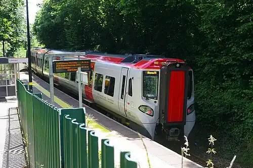 Six trains call each way on Mon-Sat (approximately every three hours), with four trains each way on Sundays.[2] All services from here were suspended following major flood damage to the track and other infrastructure in the area by the River Conwy as a result of Storm Gareth on 16 March 2019. A replacement bus service operated, with repairs expected to take several months to complete.[3] The line reopened northwards to Llandudno on 18 July 2019, ahead of the staging of the National Eisteddfod in the town;[4] the remainder followed from 24 July. Further damage to the line caused by flooding from Storm Ciara forced the closure of the route again on 8 February 2020; following repairs costing £2.2m.[5] The line reopened on 28 September 2020.[6]