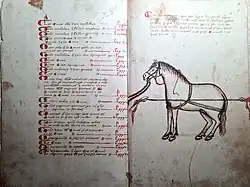 The Llibre de Menescalia is a 1436 Catalan manuscript by Manuel Dieç, translated into Spanish as Libro de Albeytería,[1] that became the reference veterinary work about horses of the 15th and 16th centuries. At the time, the Catalan language had spread throughout the Mediterranean and was understood in a broad part of Europe for its similarity to Occitan and other languages. The book also had great success in Castile, for it was translated into Spanish in 1499 and republished in that language several times. The work consists of two books. The first, Book of Menescalia, deals with the external anatomy of the horse, qualities that must concur for the choice of the parents, coat, the way to raise the foal, etc. The second, Treatise of the Menescalia of the mules, is about the mules widely used in Catalonia.[2]