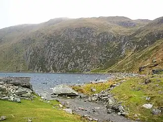 Cliffs rise steeply from its western edge, up to the summit of Foel Grach, and down from which most of its feeder streams flow.