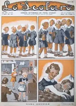 The magazine was founded by G. B. Barletta and started its publications with the name Facciamo gli Italiani ("Let's do the Italians"), changing its name in Lo Scolaro in 1915.[2] It came out weekly during the school year, and fortnightly/monthly during the summer. It was distributed on newsstands and in over three thousand schools.[2] The magazine alternated topical headings and curiosity columns, short stories and serials, games, articles on school or teaching topics and comics.[2] Some important Italian cartoonists collaborated to the magazine, including Luciano Bottaro (who here introduced the Pon Pon character), Franco Aloisi, Giovan Battista Carpi, Giulio Chierchini, Paolo Piffarerio, Gallieno Ferri, Guido Zamperoni.[2] In addition to humorous and adventurous comics, in deference to the educational function of the magazine, there were published numerous comics which adapted famous novels, biographies and historical events.[2]