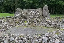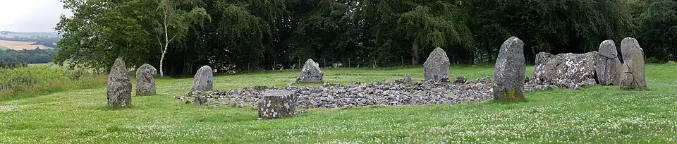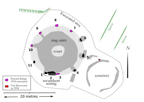 In 1934 Howard Kilbride-Jones led a major excavation of the site after it had come into state care.[note 2][19][20] Cremated bones and over 100 sherds of probable late Bronze Age pottery were found when the top 0.3–0.6 metres (1 ft 0 in – 2 ft 0 in) of soil were removed and the kerb stones were also discovered. Kilbride-Jones uncovered an open court (without kerb stones) or a large pit at the centre of the cairn – it is now thought it was probably a pit.[21] Kilbride-Jones thought the recumbent had been placed before the cairn was built and this has recently found support[22][23][note 3] Another current view is that the recumbent had been one of the earliest features to have been constructed.[21][23] In summary, the earliest finds are Neolithic sherds of pottery, the recumbent was set in the early Bronze Age, and most of the sherds are from the late Bronze Age.[21] In 1989 the stones were removed from the 4.3-metre-diameter (14 ft) central area of the ring cairn and the site was re-turfed.[25] Welfare considers that the cairn originally lacked a court but that a ring cairn might have been briefly created around 1000 BCE.[26]