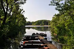 After World War I, the Lobau became a popular recreational area. Tram line 317 from Kagran transported people there, where they could enjoy long hikes and spend relaxing days by the water without encountering large crowds. In the 1920s, naturism, whether officially permitted or not, took off in the Lobau. Along its old river arms, naturist groups established meeting spots that continue to exist to this day.[2] The Dechantlacke and Panozzalacke are popular swimming spots in the Lobau. A nature trail called Obere Lobau was established in the national park area. It runs from the park entrance at Saltenstraße to the entrance at Dechantweg. The Lobau is connected by numerous hiking trails, including the long-distance Ostösterreichischer Grenzlandweg and the European long-distance trails E4 and E8.[3]