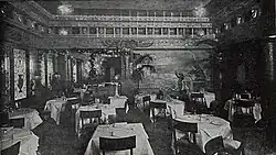 Due to their lavish, palatial interiors and late-night gayeties in which lobster was frequently served, the establishments acquired the "Lobster Palace" sobriquet.[6] Open to everyone who had the means to pay, the palaces became the trendy destination for New York’s wealthy and well-to-do. According to one account, lobster palace society in New York City counted among its denizens "Wall Street financiers, industrial magnates, gilded factions of the Four Hundred, gaudy playboys, journalists, celebrities from the Bohemia of the arts, the greatest stars of the theater, gamblers, jockeys, pugilists, professional beauties, chorus girls, kept women."[7][8] The traditional social elite of New York City, however, were not counted among the regulars who patronized the palaces, although they did drop in from time to time.[9]