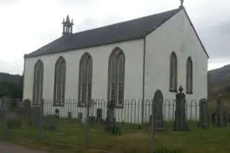 The building: The grade B listed building is sited in the new Lochcarron Burial Ground, an active graveyard (owned and maintained by the council), which contains the remains of Lauchlan Watt at the east end of the building (visible in the picture). There are no graves older than the church, those are sited in the graveyard of the 1751 Old Parish Church. The building has been remodelled inside three times since being built.[1] The original layout was a central high pulpit with galleries either side. Later it was remodelled into two rooms, the galleries were removed and the pulpit remodelled. A large maintenance was undertaken by Alexander Ross (architect) which included adding skews. In the final remodelling a gallery was placed at the opposite end to the pulpit. Under the gallery are two vestry rooms, steps up to the gallery and a passageway to the porch. The entrance porch was an addition during the remodelling. This is a newer front door as the original access was through two doors either side of the pulpit, these were blocked up when two doors in the rear wall were added, one of these was blocked up when the new porch entrance was added. In fact, the blocked entrance door in the west rear wall was turned into a window. At some point the raised wooden floors were added, as before that it was a soil floor with boards over.[4]