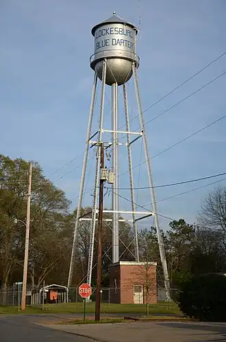 Lockesburg Waterworks are a water storage and distribution facility at the junction of Hickory and Azalea Streets in Lockesburg, Arkansas. The facility consists of a water tower and three water storage sheds, of which the tower was built in 1936 with funding assistance from the Public Works Administration, a Depression-era works project. The older shed was built in 1945, and the second was built in 1990. The tower is a metal structure with four legs supported and stabilized by cross bracing, with a metal tank at the top which is sheltered by a conical roof. The oldest shed is a modest square brick structure at the center of the complex, while the 1990 shed is located at the southwest corner of the property.[2]