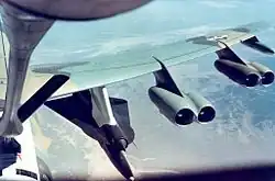 Following the accident, Johnson suggested launching the D-21 from the Boeing B-52 Stratofortress bomber and adding a solid rocket booster to get it up to speed.[13] The drone was modified by adding attachment points on its spine to mate with the carrying pylon on the B-52 and its belly attachment points were adapted to accommodate the rocket booster necessary to increase its speed and allow its ramjet to operate. Its vertical stabilizer was increased in size by approximately 20%. The modified drone version was designated D-21B (there was no D-21A). Two B-52Hs were modified to carry two drones each by means of two large underwing pylons that replaced the smaller pylons used for the AGM-28 Hound Dog cruise missiles. The tail gunner's and electronic warfare officer's stations were replaced with two launch control stations. Command and telemetry systems were added, and high-speed cameras were installed to track the drones as they separated from the pylons. The launch control officer on the B-52H could communicate with the D-21B and could make it self-destruct.[14]