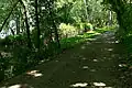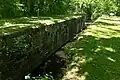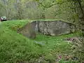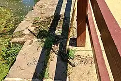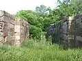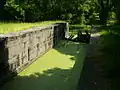 The 1828 design originally filled the lock chamber through the use of culverts in the lock masonry. The wicket, i.e. large paddle valve, hidden in the masonry recess where the upper gate fit in, would be opened, and water would flow through the lock masonry to three openings in the lock chamber. Both sides of the lock had these, so there would be a total of 2 wickets, and 6 openings. The upper gate is above the breast wall.[24][25] Most of the wicket openings in the upper gate recess have been closed with masonry, but one wicket at Violettes Lock is still intact as of 2013 (see photo). Note that modern replacement gates in locks 1–23, have the wickets in the gates, since the original wickets in the lock masonry are inoperable. This system of routing water through the masonry was abandoned due to the tendency for debris to clog the opening.[26]