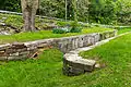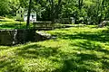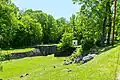 In 1875, the company decided to experiment with double boats (one boat tied to another, pulled by a team of mules) allowing them to decrease freight costs by 50%.[32][33] The company extended 14 locks to do so. Locks 25 through 32 were extended for that reason. 11 locks were extended at the lower end (like Lock 25) and 3 were extended at the upper end, for a total of 14 extended locks on the canal. While since that time the stones from the downstream extensions have often been removed, the early mule rise (i.e. the towpath rise before the lock appears 120 feet earlier than normal) indicates the locks extended at the lower end.[34] Lander Lock (No. 29) is a good example of this.[35] While physical evidence shows that locks 25, 27, 29–33, 37, 38, 43, & 60 also were lengthened, Canal records only mention locks 5-7 being lengthened [36]