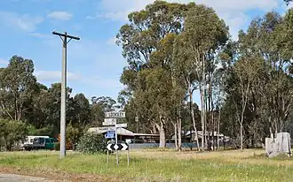 Locksley was initially part of Henry Kent Hughes' Avenel pastoral station, taken up in the 1830s and early settlement occurred along Burnt Creek and the hills of Teneriffe. A Cobb & Co coach service along the Sydney to Melbourne road was established with a horse changing station at Barlow's Lagoon, about a mile from Locksley. The Locksley railway station opened in 1882 as Burnt Creek, (changing its name the following year as there was another station of that name in Victoria), with sidings serving up to five sawmills, which were supplying fire wood to Melbourne, and a local hall was built in 1887.[3][4] In the summer of 1901 a large bush fire started near Locksley which resulted in destruction of many properties and in the following autumn and winter, severe soil erosion was caused in many of the creeks.[5] A post office opened on 1 May 1886, and briefly operated from the Railway station from 1910 to 1914, but closed on 29 September 1973.[6] A butter factory operated for a short while but was closed down and finally sold for removal in 1899.[7]