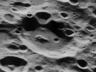 Lodygin is a lunar impact crater to the southeast of the much larger crater Galois. To the east-northeast is the crater Paschen, and to the south-southwest is the immense Apollo.