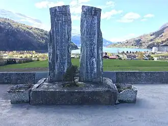 There are two stone pillars in the churchyard that memorialize the local residents who died in 1905 and 1936 when the rock slides from the mountain Ramnefjellet caused tsunamis which flooded many farms surrounding the lake Lovatnet.