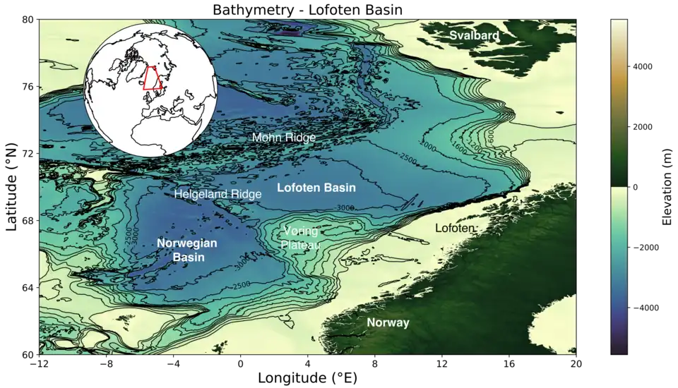 The Lofoten Basin is a well-defined topographic depression of about 3250 m depth, situated between the Norwegian continental slope in the east, the Vøring Plateau and the Helgeland Ridge in the south and southwest, and the Mohn Ridge in the northwest.[6] The complex bathymetric structure is pivotal to locate the two major ocean currents of the basin: