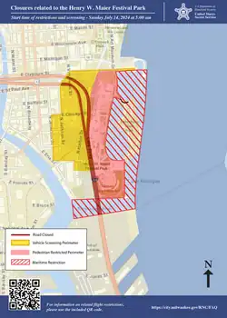 The security perimeters of the convention were twofold: there was a central "hard" security perimeters in which only credentialed individuals were permitted, and an outer security perimeters in which credentials were not required, but for which vehicles were screened at security checkpoints prior to entry. Two sets of separate security perimeters were established for the convention: a main one surrounding the convention's main venues, that was scheduled to be "hardened" (begin to enter effect) on July 14; and a second one securing the Henry Maier Festival Park on July 14.[93] The close proximity of the main venue and several secondary venues used for the convention allowed them all to be contained in a single "hard" security zone.[94] The vehicle screening perimeter of the security zone surrounding the main venues of the convention measured ten city blocks by six city blocks.[83] The Milwaukee Common Council approved the restriction of many items from the convention's security footprint.[95]