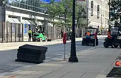 The Milwaukee Police Department, Wisconsin State Patrol, and other local law enforcement agencies played a key role in convention safety and security.[82] Additionally, of out-of-city police officers assisted in securing the city during the convention.[90] As of April 2023, it was estimated that security for the Republican National Convention could necessitate 4,500 police officers from agencies outside of Milwaukee Police Department. This number is 1,500 greater than the number of outside police officers that had originally been expected in the plans for a full-scale 2020 Democratic National Convention in the city.[84] 44 police agencies from elsewhere in Wisconsin and more than 63 out-of-state police departments from 24 states plus the District of Columbia are providing officers to help secure and police Milwaukee during the convention. Included were two agencies with history of major party conventions previously held in their own cities: Cleveland MetroPark police and Cuyahoga County Sheriff's Office (Cleveland hosted the 2016 RNC) as well as the Charlotte-Mecklenburg Police Department (Charlotte hosted the 2012 DNC and a portion of the downscaled 2020 RNC).[76]