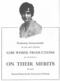 During the war years, Weber "achieved tremendous success by combining a canny commercial sense with a rare vision of cinema as a moral tool".[15] At her zenith, "few men, before or since, have retained such absolute control over the films they have directed—and certainly no women directors have achieved the all-embracing, powerful status once held by Lois Weber".[16] By 1920, Weber was considered the "premier woman director of the screen and author and producer of the biggest money making features in the history of the film business".[14]
