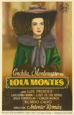 Lola Montes is a 1944 Spanish historical drama film directed by Antonio Román and starring Conchita Montenegro, Luis Prendes and Jesús Tordesillas.[1] It portrays the life of the Irish dancer and courtesan Lola Montez.