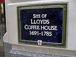 Blue plaque marking the location of Lloyd's Coffee House, notable in the development of the City's insurance market