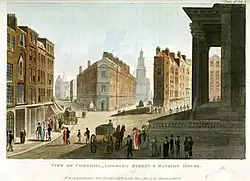 Note the monument outside St Mary Woolnoth, which was taken down and re-erected at Ballard Down in 1892.[12]