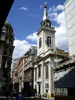 St Mary Woolnoth is situated on the corner of Lombard Street and King William Street, and continues to be an active parish church. The City & South London Railway had obtained permission to demolish the 18th-century church and build a station (originally proposed to be named "Lombard Street") on the site. After public protest, the company changed its plans to build only a sub-surface ticket hall and lift entrance in the crypt of the church. This necessitated moving the bodies elsewhere, strengthening the crypt with a steel framework and underpinning the church's foundations.