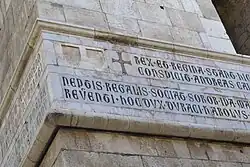 Unlike Gothic capitals, Lombardic capitals were also used to write words or entire phrases. They were used both in illuminated manuscripts and monumental inscriptions, like the bell tower of Santa Chiara, Naples. In Italian, the style is known as "Longobarda" after an earlier spelling of Lombardy (Longobardia).[3]