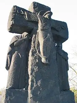 There is extensive information about the history of the cemetery at the entrance, as well as an information center. The cemetery can be entered via a crypt designed by Robert Tischler on which there is a large crucifixion group made of basalt from the Eifel. The statues of John and Mary are 3.30 meters high; the total height of the statues is 6 meters, and the weight is 39 tons. In the crypt is an effigy of a fallen soldier.